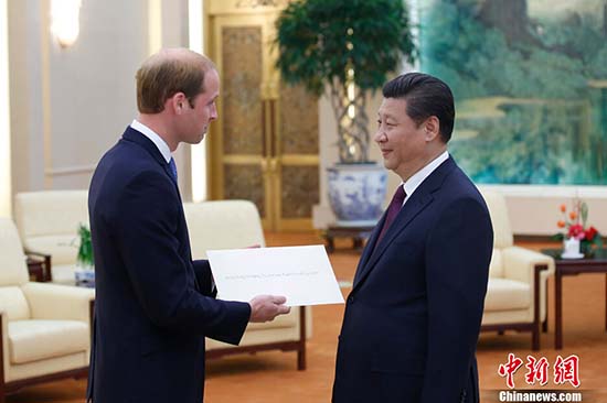 President Xi Jinping (R) Prince William, Duke of Cambridge (L), in Beijing on March 2, 2015. During the meeting, Prince William handed President Xi Jinping the invitation letter from Queen Elizabeth II.