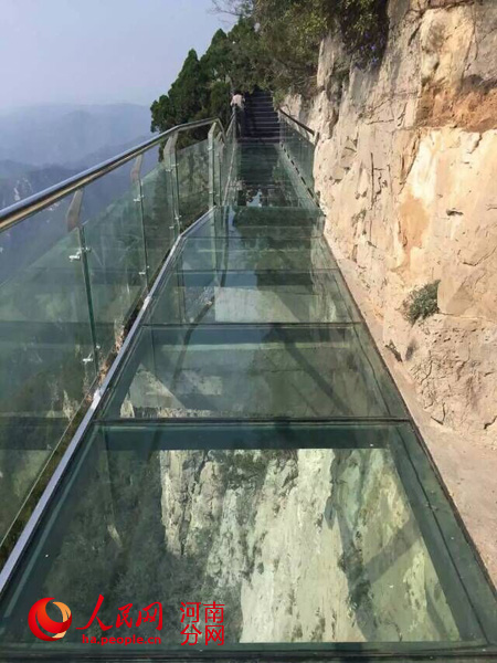 The glass path was opened on September 20, 2015. Built closely along the U-shape cliff, it is 68 meters in length and overlooks a thousand-meter mountain. The glass was said to be able to carry 800 kilogram of weight per square meter.