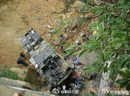 A bus fell off a bridge in Luo'erling town of Huoshan county around 7 a.m.