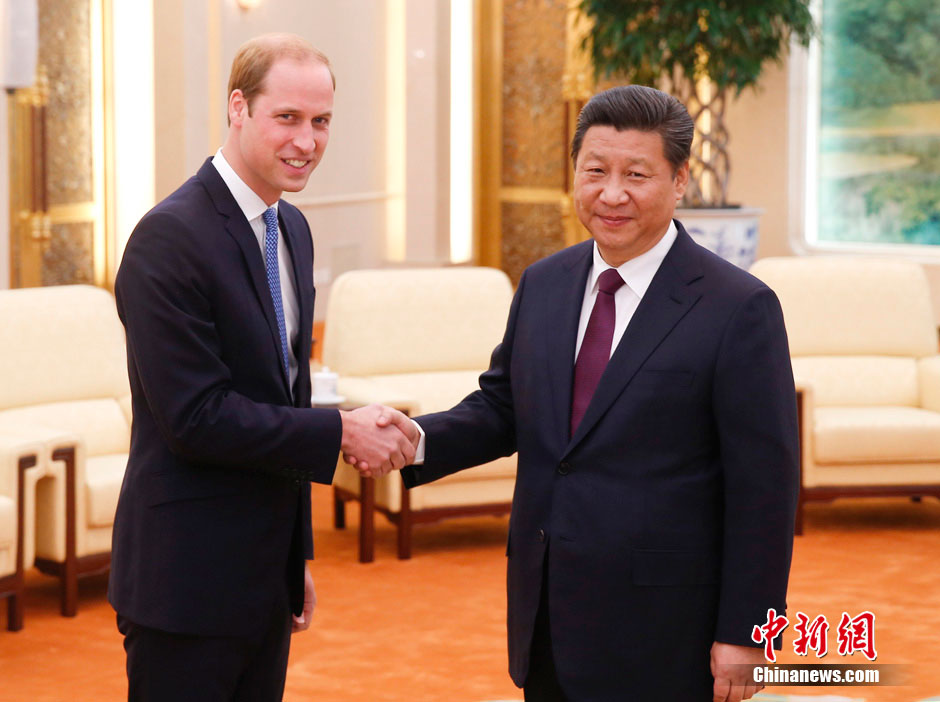 Chinese President Xi Jinping (R) meets with Britain's Prince William at the Great Hall of the People in Beijing, capital of China, March 2, 2015. President Xi told the royal he was looking forward to visiting the United Kingdom, at the invitation of Queen Elizabeth II.(Photo/CNS)
