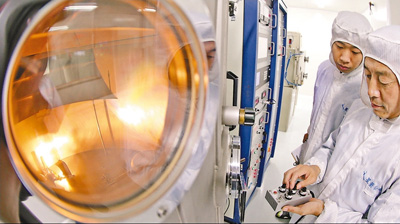 Workers put a coating on the glass. (Photo by Xinhua News Agency/Yang Shiyao)