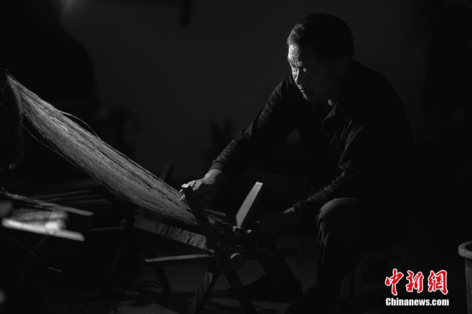 A worker brushes ramies in a company in Panlong Town, Rongchang District in Chongqing. (Chinanews/Liao Pan)