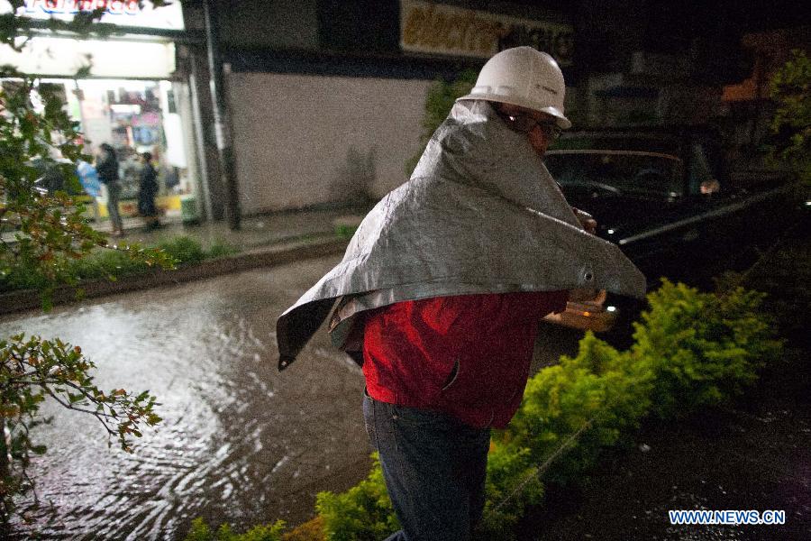 A man protects himself from the rain caused by the hurricane "Patricia" in Ameca, Jalisco state, Mexico, on Oct. 23, 2015. An hour after Hurricane Patricia made landfall Friday evening in the Mexican state of Jalisco, bringing strong winds and heavy rain over the west of the country, it was downgraded to a Category 4 hurricane. (Xinhua/Pedro Mera)