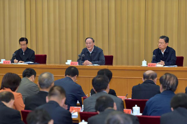 Wang Qishan (C,back), a member of the Standing Committee of the Political Bureau of the Communist Party of China (CPC) Central Committee and secretary of the CPC Central Commission for Discipline Inspection, addresses a meeting on anti-graft inspection in Beijing, capital of China, Oct. 23, 2015. [Photo: Xinhua/Li Tao]
