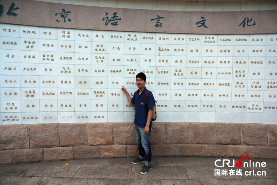 Satosi Nishida takes a photo in front of the International Wall at Beijing Language and Culture Universary. (Photo/Cri.cn)
