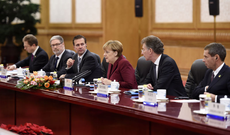 Chinese Premier Li Keqiang met with German Chancellor Angela Merkel Thursday morning at the Great Hall of the People in Beijing.