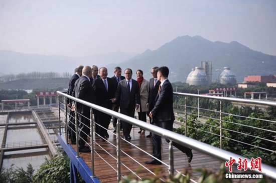 French President Francois Hollande visits a wastewater treatment plant in Chongqin.(Photo/China News Service)