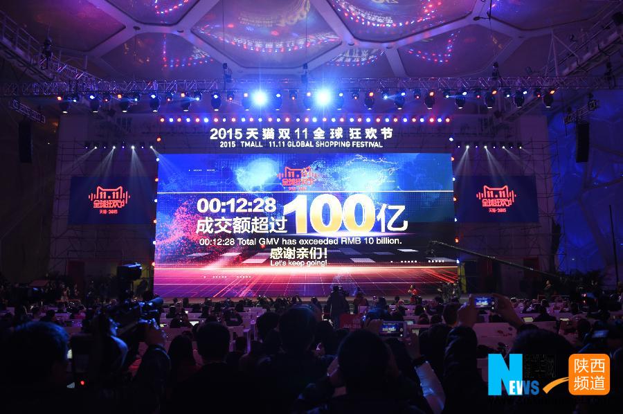 A big screen shows live data of gross merchandise volume of the 2015 Tmall Global Shopping Festival on Nov 11, 2015. [Photo/Xinhua]