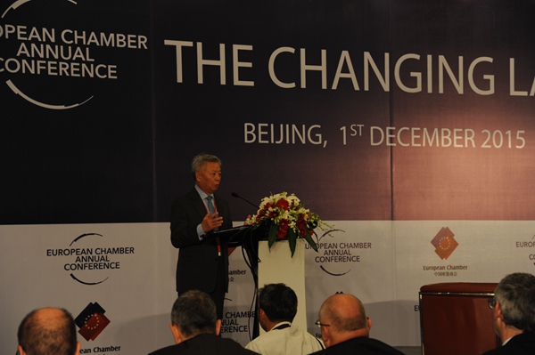 Jin Liqun, President-designate of Asian Infrastructure Investment Bank, delivers a speech at 2015 annual conference of European Chamber on Dec.1, 2015. (People's Dailly Online/Yuan Can)