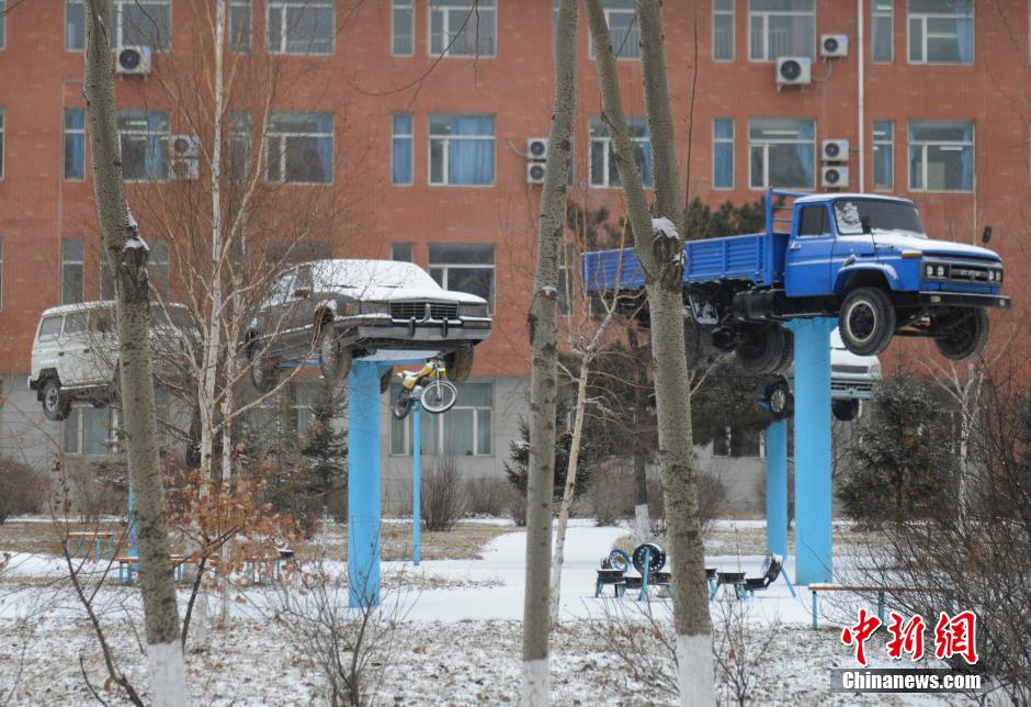 Photo taken on Dec. 1 shows that various types of vehicles including sedan, truck, and motorcycle are supported in mid-air by pillars in a vocational technical school in Changchun, northeast China’s Jilin province. These “cars in air” are very eye-catching since they are displayed along the road. (Photo/CNS)