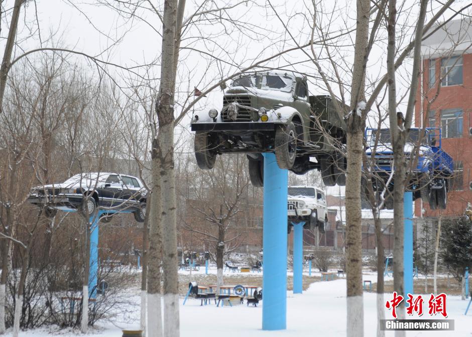 Photo taken on Dec. 1 shows that various types of vehicles including sedan, truck, and motorcycle are supported in mid-air by pillars in a vocational technical school in Changchun, northeast China’s Jilin province. These “cars in air” are very eye-catching since they are displayed along the road. (Photo/CNS)