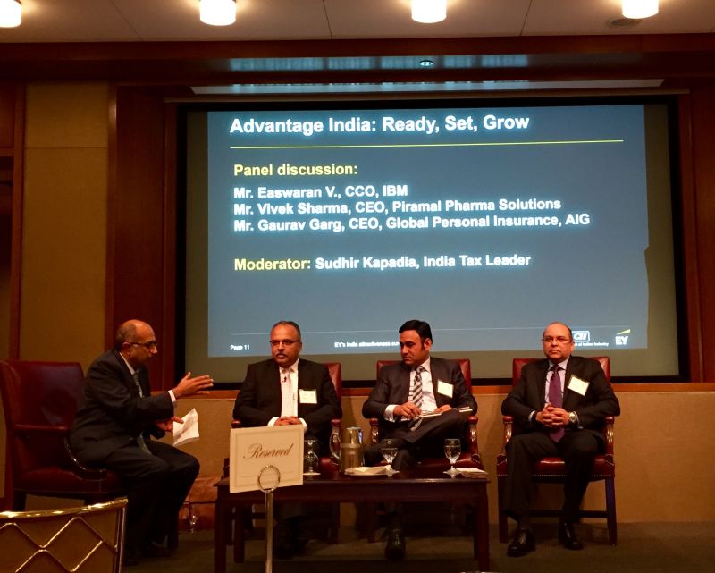 From left to right, picture shows SudhirKapadia, the partner & National Tax Leader at EY India; EaswaranVekatasubramanian, CCO of IBM; Vivek Sharma, CEO of PiramalPharma Solutions; and GauravGarg, CEO of Global Personal Insurance at AIG, engaging in panel discussion at the event. (Photo/people.cn)