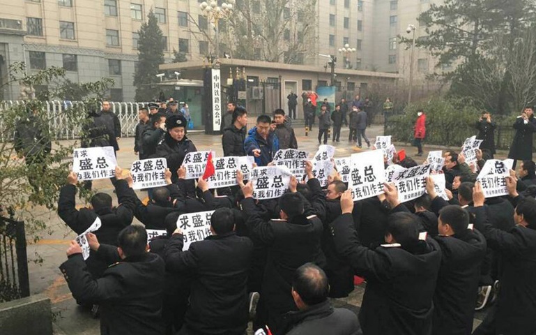 Around 40 employees of China Railway Corp kneeled down in front of the corporation’s headquarter in Beijing on December 9, 2015, appealing for equal pay and protesting against the terminations of contractors.