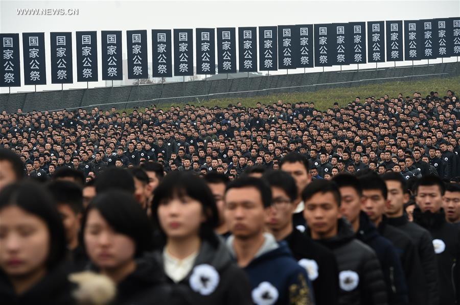 Photo taken on Dec. 13, 2015 shows the scene of state memorial ceremony for China's second National Memorial Day for Nanjing Massacre Victims at the memorial hall for the massacre victims in Nanjing, east China's Jiangsu Province. (Xinhua/Han Yuqing)