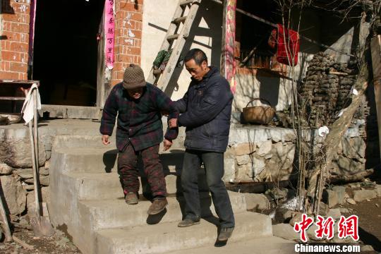 Song Hongjun helps his mother walk down the steps.