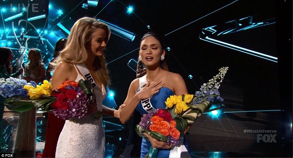 Miss Philippines was in shock, her lip quivering as second-runner up Miss USA Olivia Jordan congratulated her