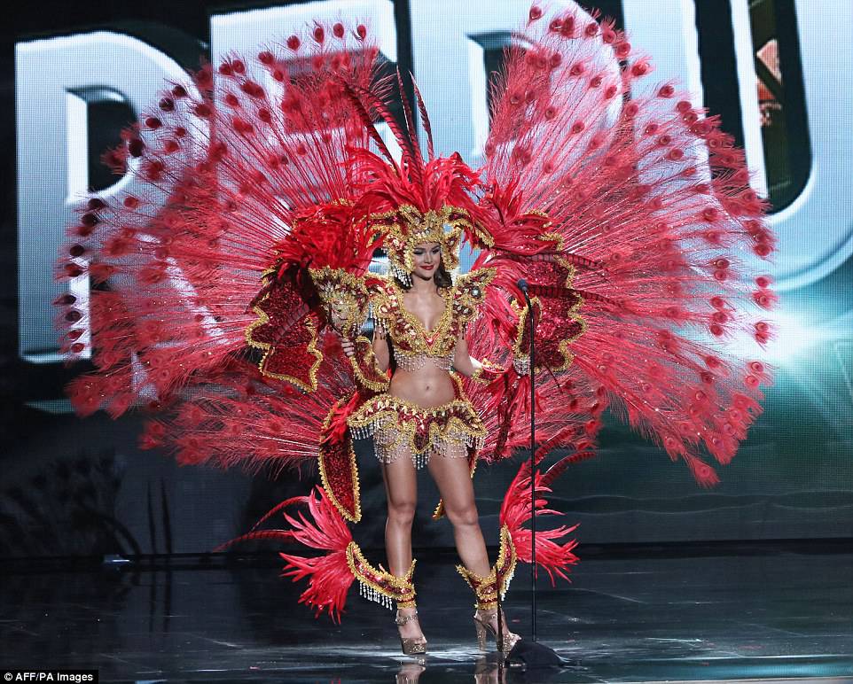 Miss Dominican Republic Clarissa Molina (left) wore an ensemble outfitted with red peacock feathers