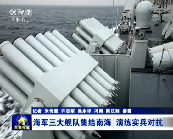 Frigates, submarines, early-warning aircrafts, fighter jets and other types of military vessels from the Navy's North Sea, East Sea and South Sea fleets travel a long distance and participate in a massive combat exercise in the South China Sea last Wednesday.(CCTV screenshot)