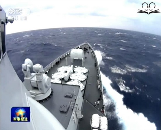 Frigates, submarines, early-warning aircrafts, fighter jets and other types of military vessels from the Navy's North Sea, East Sea and South Sea fleets travel a long distance and participate in a massive combat exercise in the South China Sea last Wednesday.(CCTV screenshot)
