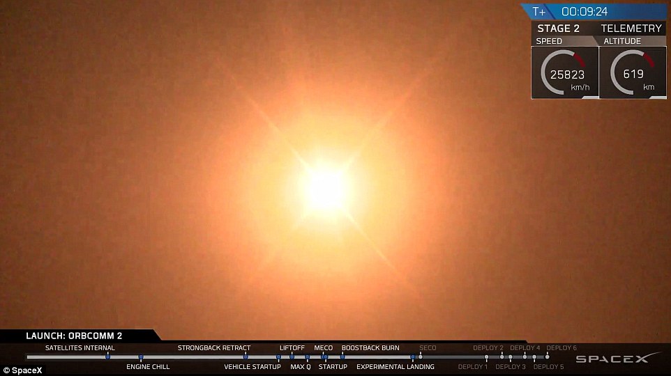 The first stage booster landing back on Earth. 'The Falcon has landed,' a commentator said above the screams and cheers of people gathered at SpaceX headquarters in Hawthorne, California
