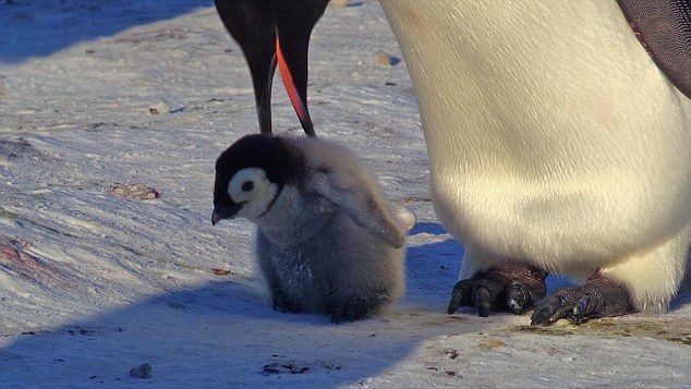 At around six weeks old, Snow Chick, who is now covered almost from head to foot in fluffy grey down, is finally able to start walking on his own two feet. Just like a human toddler, he's finding it takes some practice