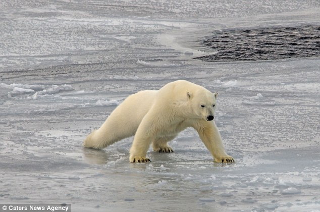 The polar bear takes a few tentative steps on the thin ice as he tries to assess if it will hold his weight