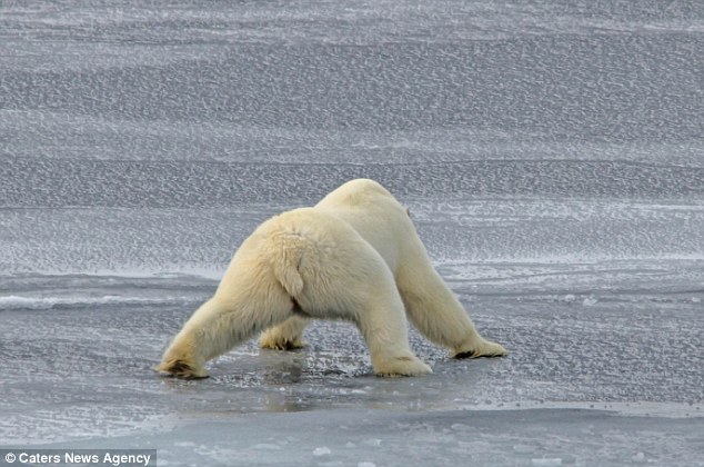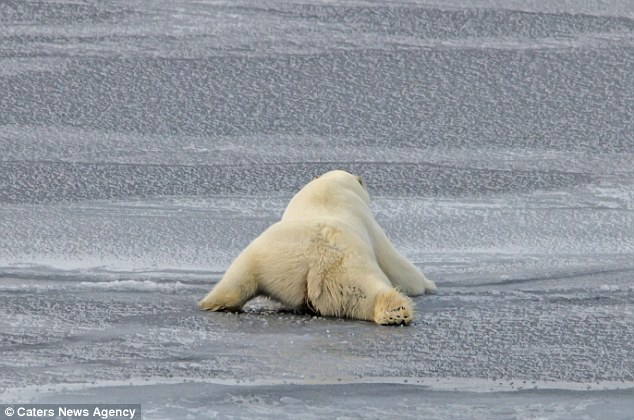 But only moments later, one of his back paws slides across the ice during the nervy food expedition