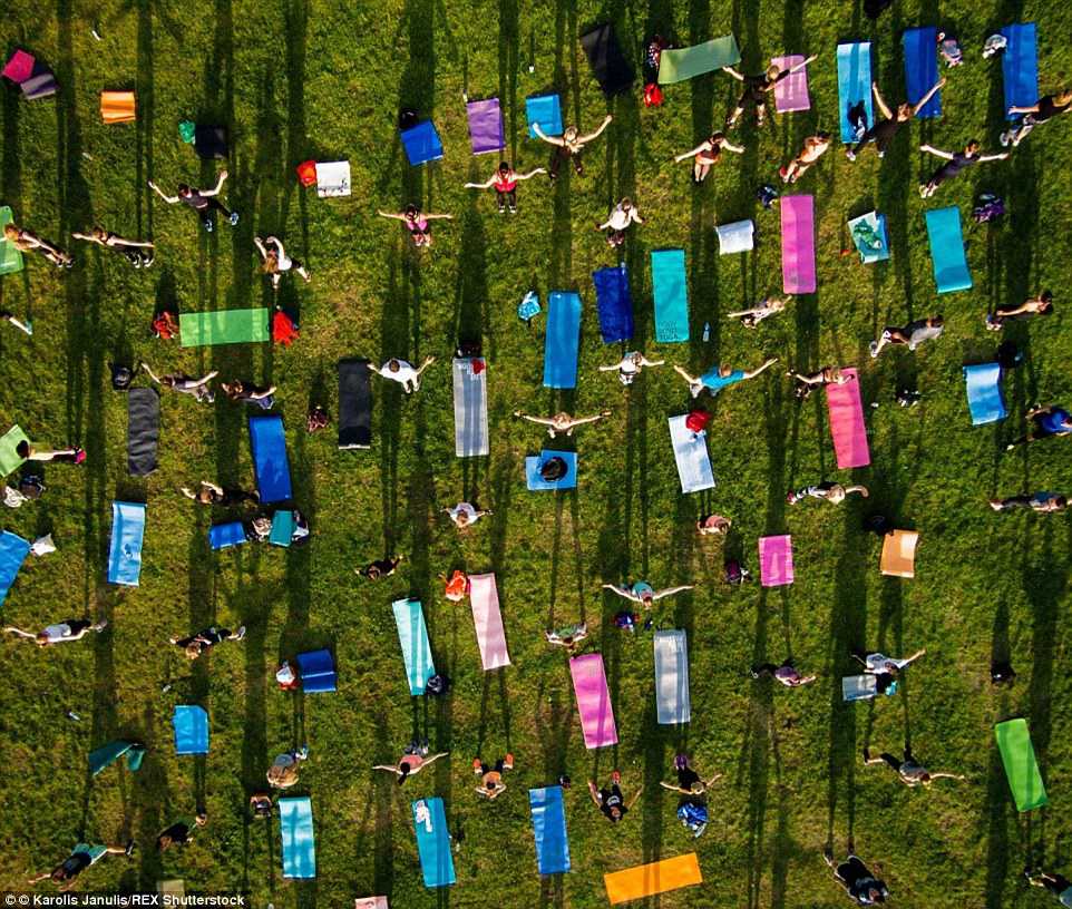 This image shows a mass exercise class in the central park of Vilnius, Lithuania, with multicoloured mats and workout outfits