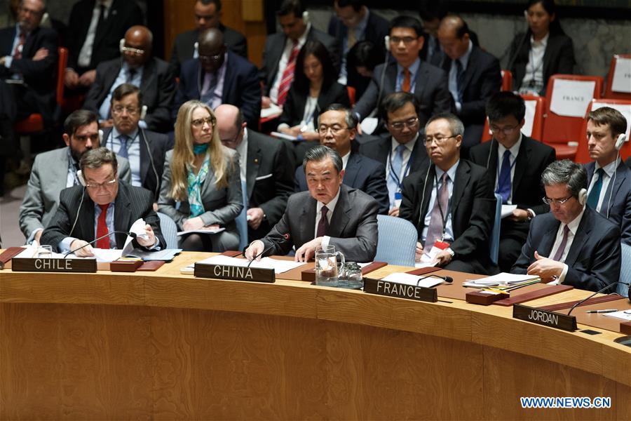 Chinese Foreign Minister Wang Yi (C, front) speaks during a United Nations Security Council meeting on Syria at the UN headquarters in New York, Dec. 18, 2015. (Xinhua/Li Muzi)
