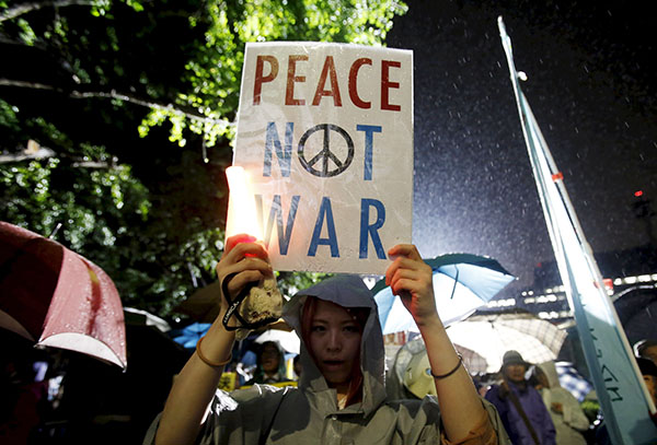 A protester holding a placard takes part in a rally against Japan's Prime Minister Shinzo Abe's security bill and his administration in front of the parliament in Tokyo, Japan, September 17, 2015.[Photo/Agencies]