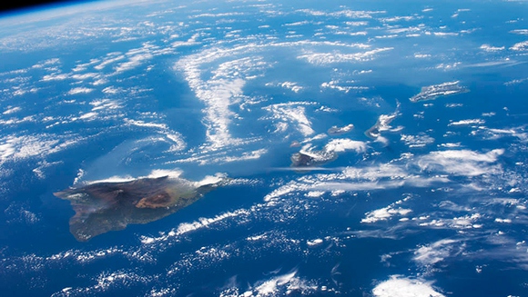 Hawaii’s Kilauea volcano (L) with the long swirls of volcanic gases wafts west from the volcano. (Photo/NASA)