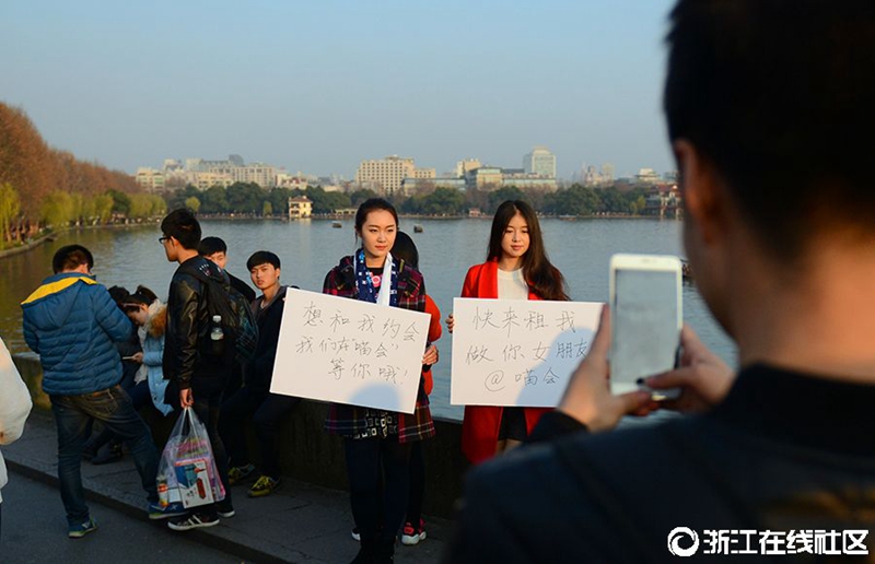 "Rent me as your girlfriend!" - Two beautiful women held a banner near the West Lake in Hangzhou, east China's Zhejiang province on Jan. 2, 2016. They said they are single college students and are willing to offer accompany services as a girlfriend in spare time. They were surrounded by the curious passers-by. Some said it was just a show. (Photo/Zjol)