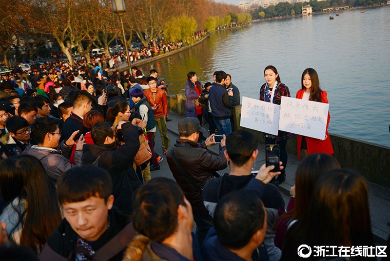 "Rent me as your girlfriend!" - Two beautiful women held a banner near the West Lake in Hangzhou, east China's Zhejiang province on Jan. 2, 2016. They said they are single college students and are willing to offer accompany services as a girlfriend in spare time. They were surrounded by the curious passers-by. Some said it was just a show. (Photo/Zjol)