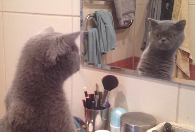 His good side: Unable to look away, Caesar jumps right back up to look at himself in the mirror from the other side of the sink