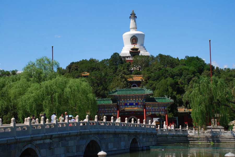 The White Dagoba, also known as "White Tower", is a 40 meters (131 feet) high stupa placed on Jade Flower Island, built to honor the visit of the 5th Dalai Lama in 1651, in Beihai park, Beijing. Its body is made of white stone. Sun, moon and flame engravings decorate the surface of the tower.