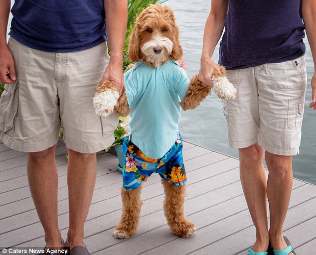 Reagan, a two-year-old Labradoodle, who lives with his owners Sandi and Eric Swiridoff, pictured, in Portland, Oregon