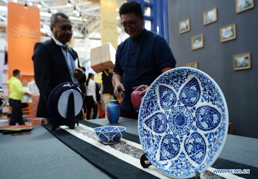 An exhibitor from China's porcelain capital Jingdezhen introduces a Islamic style craftwork of porcelain at the China-Arab States Expo 2015 in Yinchuan, capital of northwest China's Ningxia Hui Autonomous Region, Sept. 11, 2015. Islamic style craftworks made in China, Pakistan, Jordan and so on attracted many visitors at the expo. (Xinhua/Wang Peng)
