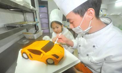 Song Jian and his daughter, Jianya, work together on a Lamborghini cake. (Photo/Wccdaily.com.cn)