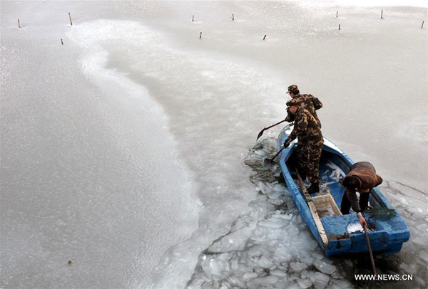 Policemen from Yangma Island Frontier Police Station help sea cucumber farmers to break ice in Yantai, east China's Shandong Province, on Jan. 20, 2016.Continuous temperature-dropping and snowing weather accelerated the expansion of sea ice in the Yellow Sea and the Bohai Sea. Part of inshore cultivation area was frozen. [Photo: xinhua]