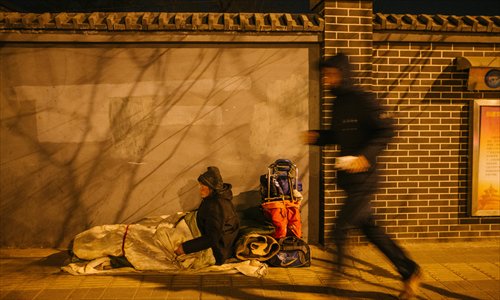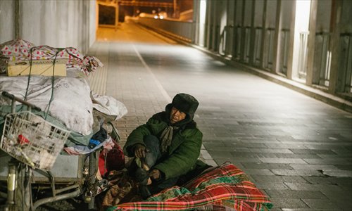 During such extreme weather, there are still people that have nowhere to stay and must brave the cold and try to survive outdoors. The Global Times reporter saw a number of people huddling under road bridges or beside walls in the capital.