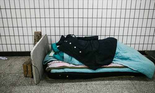 A security guard sleeps in a pedestrian tunnel in Taoranting to watch out for the homeless. Photo: Li Hao/GT