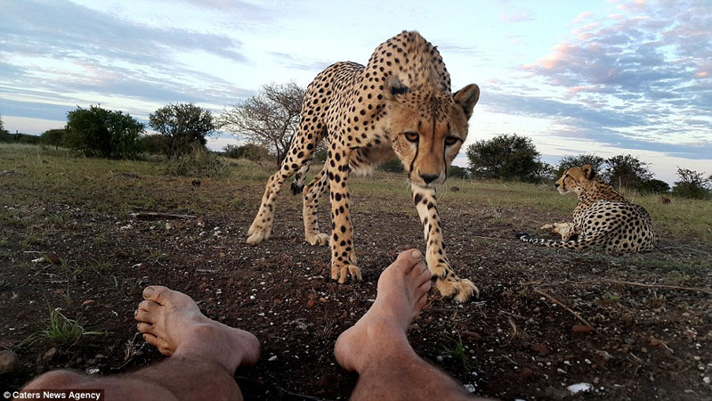This is the terrifying moment a wild cheetah approached a daring photographer in an African game reserve - before starting to lick his toes.
