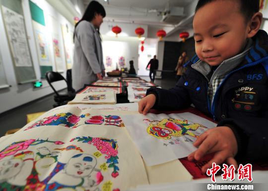 People are attracted to the New Year paintings in the 'Folk Fine Arts Works Exhibition' held in the Zhengjue Gallery in Hebei province. (CNS/Zhai Yujia)