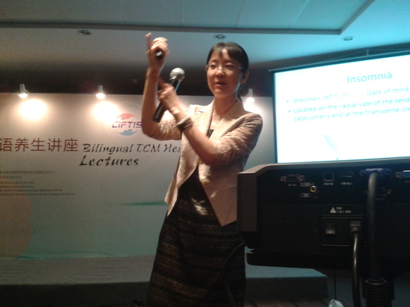 Ma Liangxiao, a PhD of the School of Acupuncture-Moxibustion & Tuina of Beijing University of Chinese Medicine introduced a form of acupressure to relieve insomnia on a bilingual TCM health lecture on May 30, 2014 in Beijing. [Photo by Song Jingli/chinadaily.com.cn]