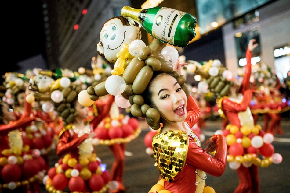 Thousands of people gather in Hong Kong to celebrate the 2016 Chinese Lunar New Year on Feb.8, 2016. A participant dressed up in a celebration parade. (Photo/People.cn)
