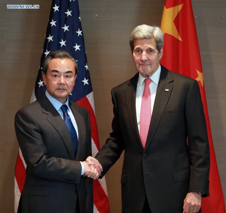 Chinese Foreign Minister Wang Yi (L) meets with U.S. Secretary of State John Kerry in Munich, Germany, Feb. 12, 2016. (Xinhua/Luo Huanhuan)