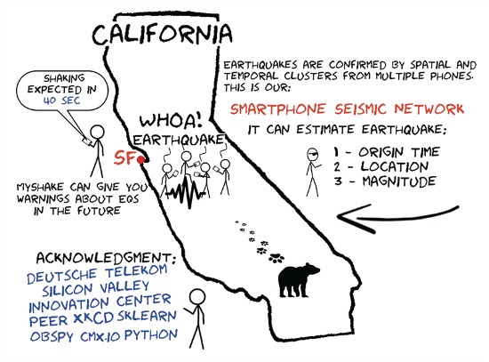 Scientists at the University of California in Berkeley released MyShake app (available for Android phones) that runs in the background with little power, so that a phone’s onboard accelerometers can record local shaking any time of the day or night.