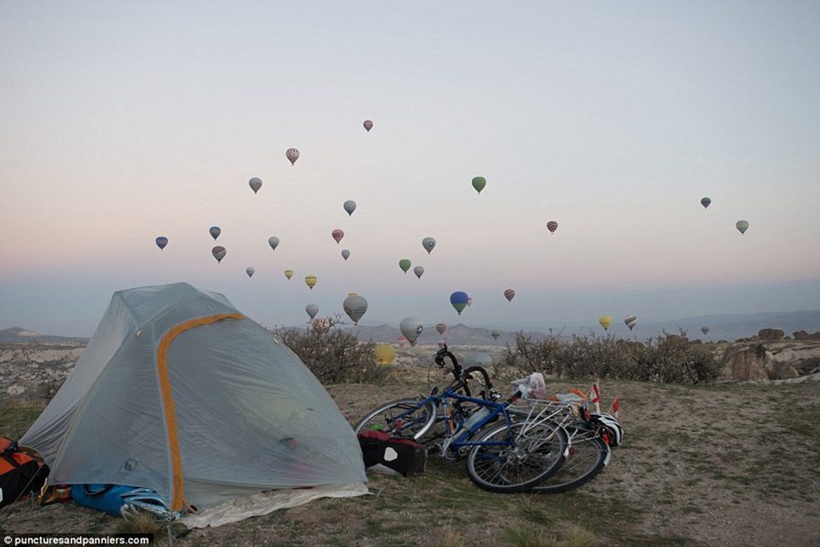 Instead of spending money on a hotel, Claire and Andre set up camp to view the stunning hot air balloons in Cappadocia, G?reme, Turkey