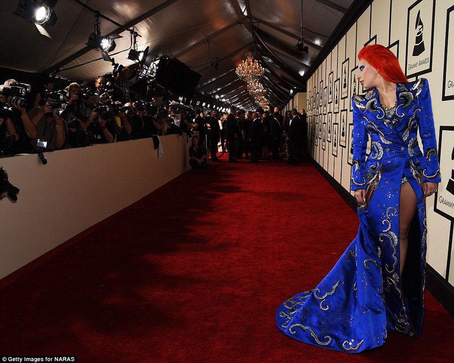 A look to remember: The 29-year-old showed off bright orange hair, an embroidered blue gown and impossibly high platform heels