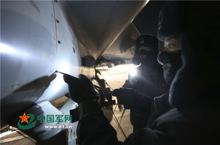 Two aerial repair technicians perform preflight inspection on a fighter jet before flight training. A PLA Air Force aviation brigade stationed in northwest China’s Xinjiang Uygur Autonomous Region recently conducted round-the-clock flight training in a frigid environment of 21 degrees below zero at the north foot of Tianshan Mountain.